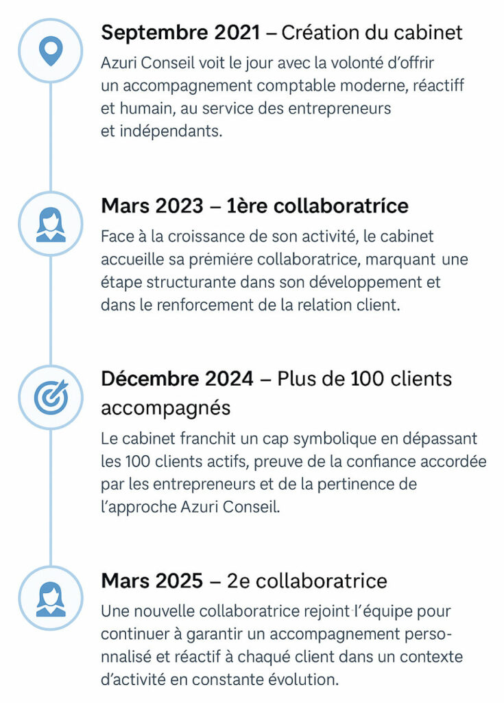 « J’ai fondé Azuri Conseil pour offrir un cabinet agile, moderne et à l’écoute des entrepreneurs. Mon ambition : que chaque client se sente compris, conseillé et accompagné avec sérieux et bienveillance. »